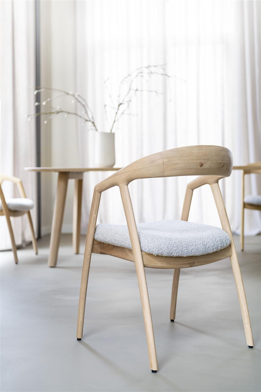 Entdecke ultimativen Komfort mit dem Armlehnstuhl DANTE. Hergestellt aus massiver Eiche mit einem natürlichen Farbton. Die Sitzfläche ist in einem eleganten, cremefarbenen Bouclestoff bezogen und bietet eine harmonische Mischung aus Luxus und skandinavischer Finesse.