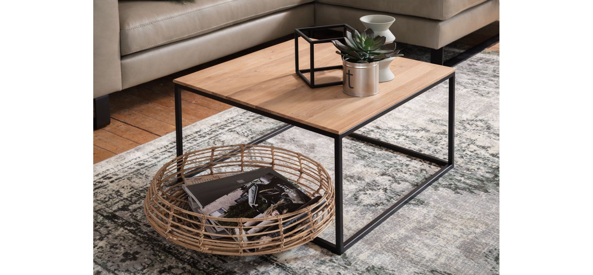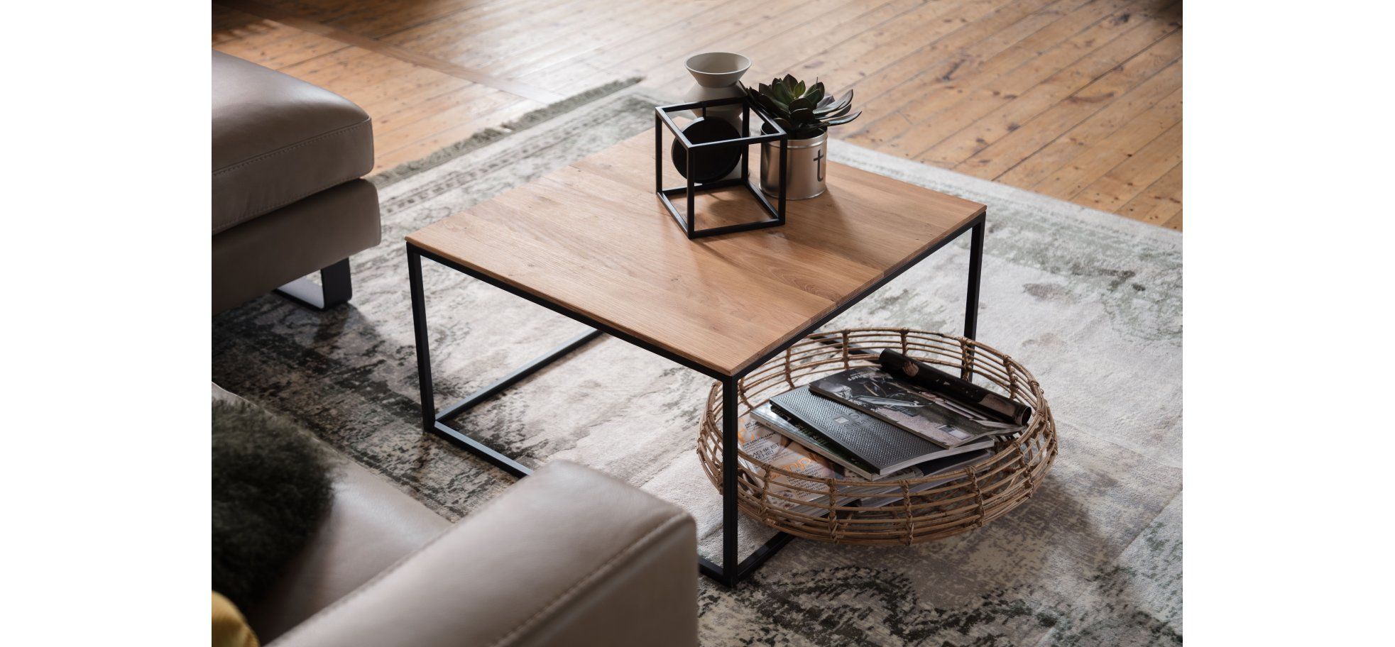 Der Couchtisch Kai hat ein filigranes Gestell aus schwarzem pulverbeschichtetem Stahl und eine Platte aus Massivholz astige Eiche. Er bereichert deinen Wohnbereich auf interessante Art und Weise und arrangiert sich stylisch und gemütlich zugleich in seinem Outfit zu unterschiedlichsten Einrichtungsstilen.