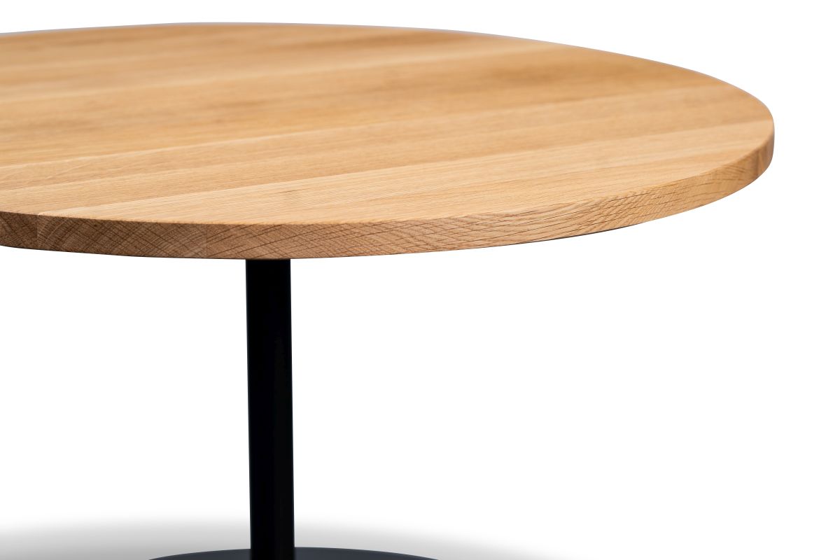 Die runde Form sorgt für eine einladende Atmosphäre und bietet genug Platz für Snacks, Getränke oder schöne Dekostücke. Dank der robusten Eichenplatte ist der Couchtisch nicht nur optisch ansprechend, sondern auch langlebig und pflegeleicht.