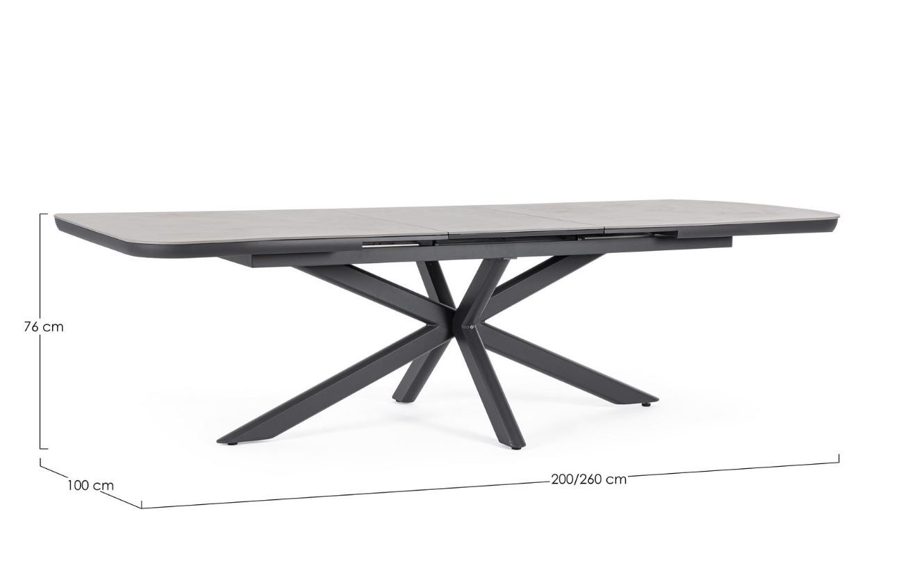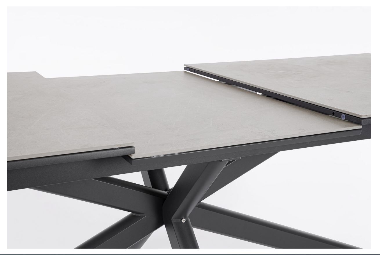 PASCAL, ca. B 200-265 x H 76 x T 100 cm, ausziehbar, Platte: Gesinnter Stein, Stärke ca. 11 mm, Gestell: Aluminium pulverbeschichtet, inklusive Ausgleichschrauben für mehr Stabilität zerlegt