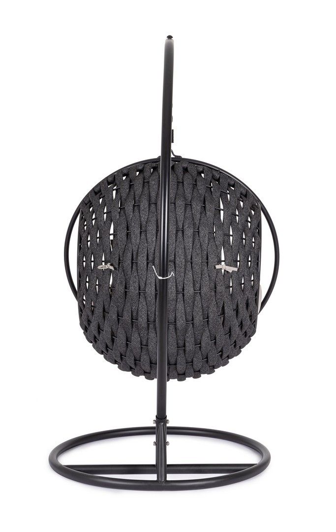 Sospeso, Geflecht aus Polyesterseil schwarz, mit Nitril-Kautschuk-Polsterung, Gestehl Stahl anthrazitgrau pulverbeschichtet, Kissen mit abnehmbarem Bezug aus wasserabweisendem Polyestergewebe, maximale Traglast 130 kg, Gesamthöhe ca. 197 cm, Ø Gestell 105 cm, Mass Korb: max. Breite ca. 107 cm, Höhe 110 cm